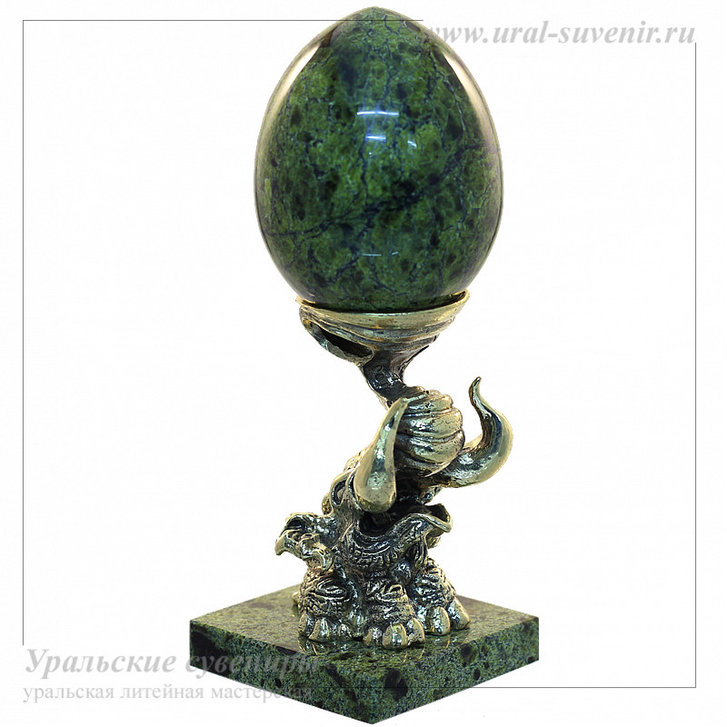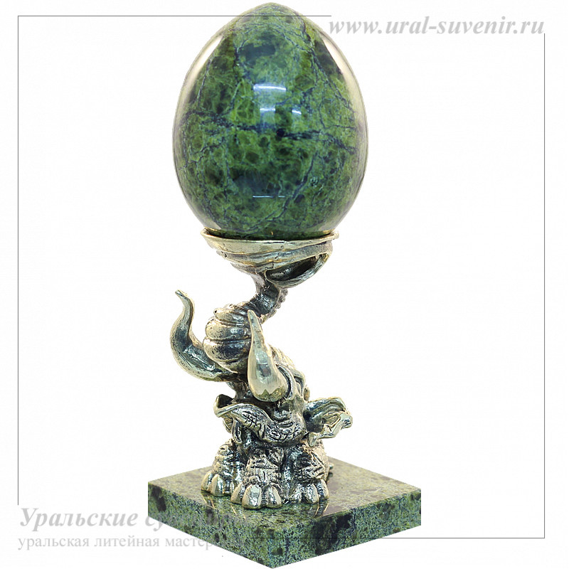 Подставка "Слон" из литьевой бронзы на подставке из светлого змеевика и украшенная яйцом из того же материала, не только станет элегантным украшением для вашего интерьера, но и станет прекрасным подарком для коллекционеров и ценителей изысканных вещей. Каждая деталь этой композиции пропитана уникальным стилем и талантом мастеров, что делает этот сувенир по-настоящему ценным и привлекательным объектом.