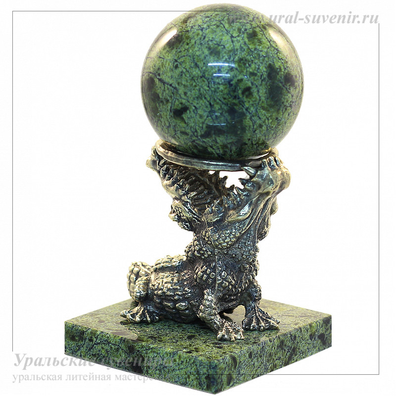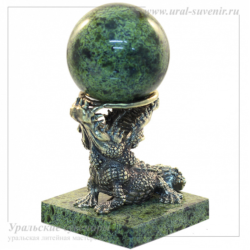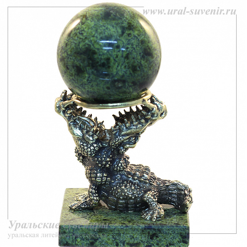 Подставка представляет собой изящную фигурку крокодила из литьевой бронзы, которая стоит на подставке из светлого змеевика. Эта комбинация материалов придает изделию особый шарм и привлекательность. На вершине подставки находится шар из светлого змеевика диаметром 43 мм, что добавляет изделию элегантности и изысканности.