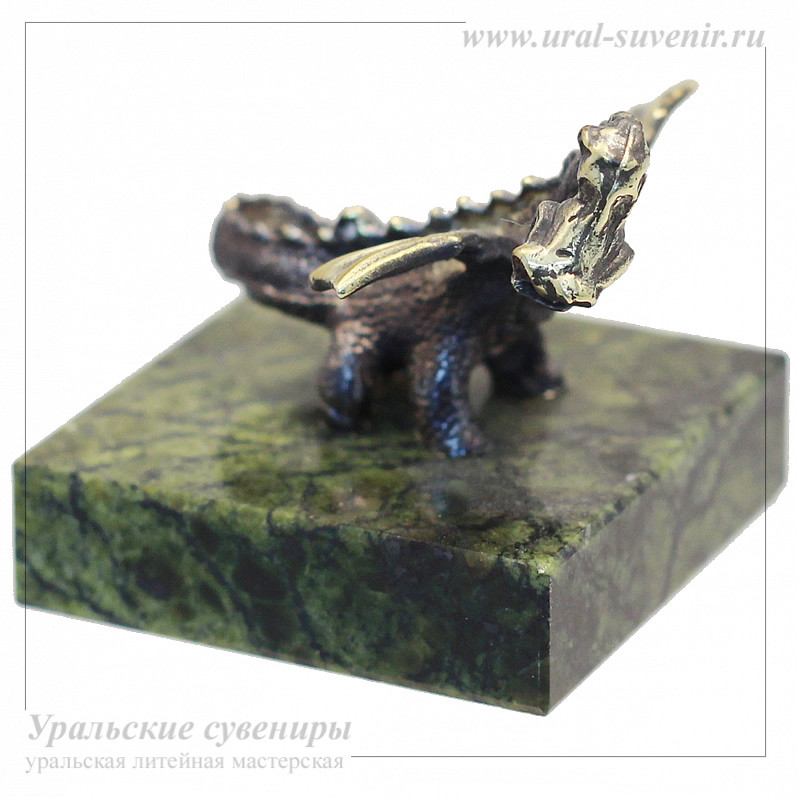 Подставка из змеевика придает статуэтке дополнительный шарм и элегантность. Этот природный камень, с его неповторимыми текстурами и оттенками, идеально сочетается с блеском бронзы, создавая гармоничное и стильное произведение искусства. Дракончик будет отлично смотреться на рабочем столе, в кабинете, на полке или даже в витрине, где его смогут заметить все ваши гости.