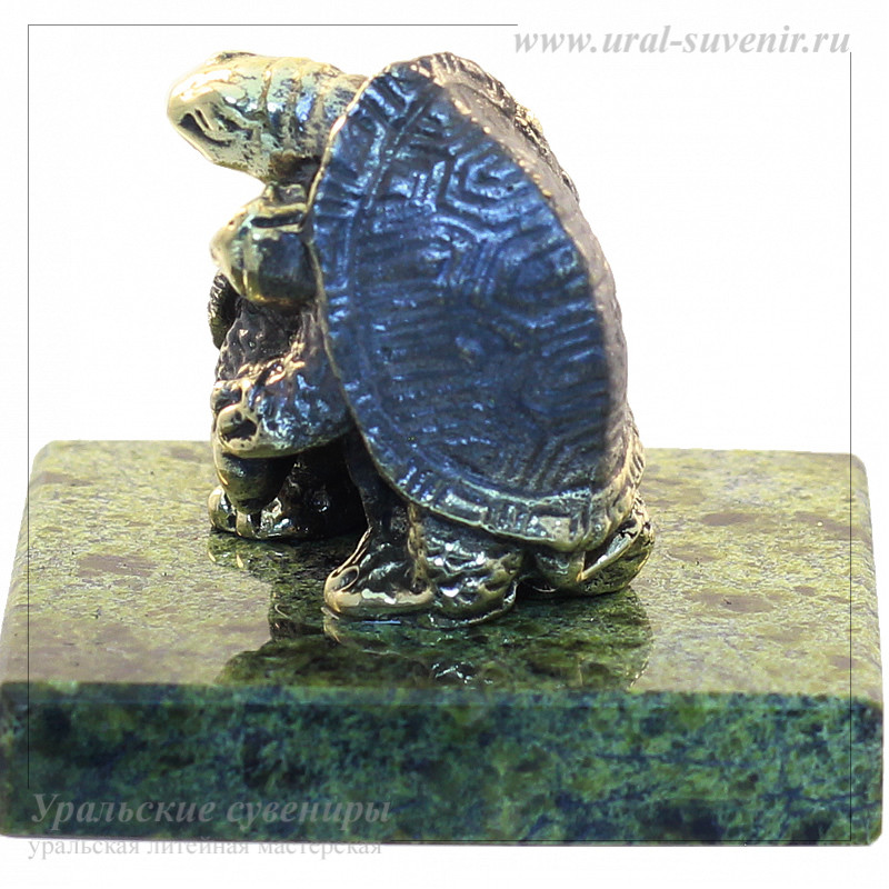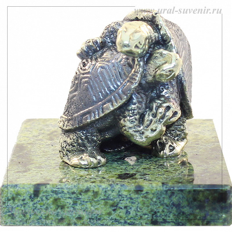 Статуэтка выполнена в виде реалистичных черепашек из литьевой бронзы, что придает ей благородный и изысканный вид. На подставке из светлого змеевика она будет прекрасным украшением вашего интерьера или оригинальным подарком для близкого человека.