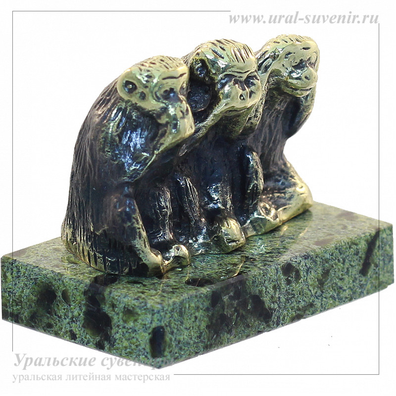 Статуэтка "Обезьяны трио - не вижу, не слышу, не скажу" - это изысканное произведение искусства, выполненное из литьевой бронзы и установленное на подставке из светлого змеевика. Размер этой статуэтки составляет 35х55х40 мм, что делает её компактным и стильным элементом декора.