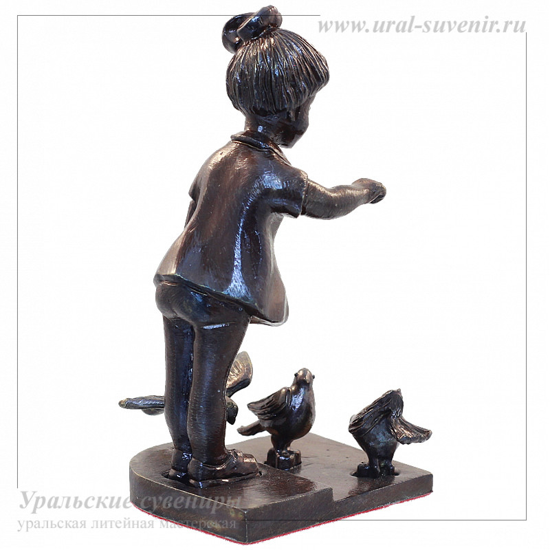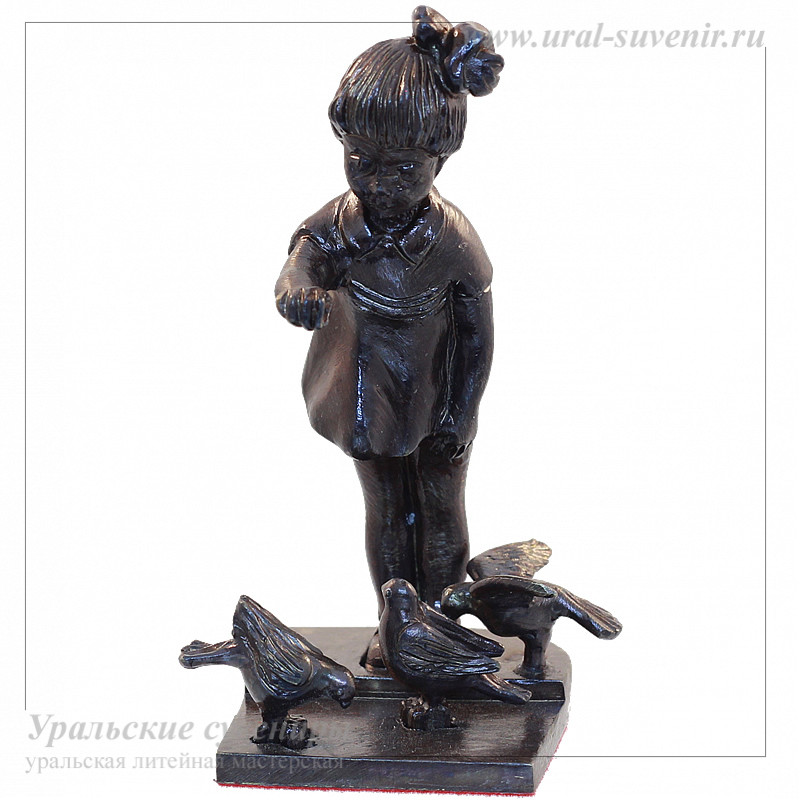 Девочка кормит голубей - миниатюра из серии Кусинское литье представляет собой уникальное произведение из литьевой бронзы, созданное в Уральской литейной ремесленной мастерской. Этот сувенир является не только красивым украшением, но и воплощением уральских художественных традиций и мастерства.